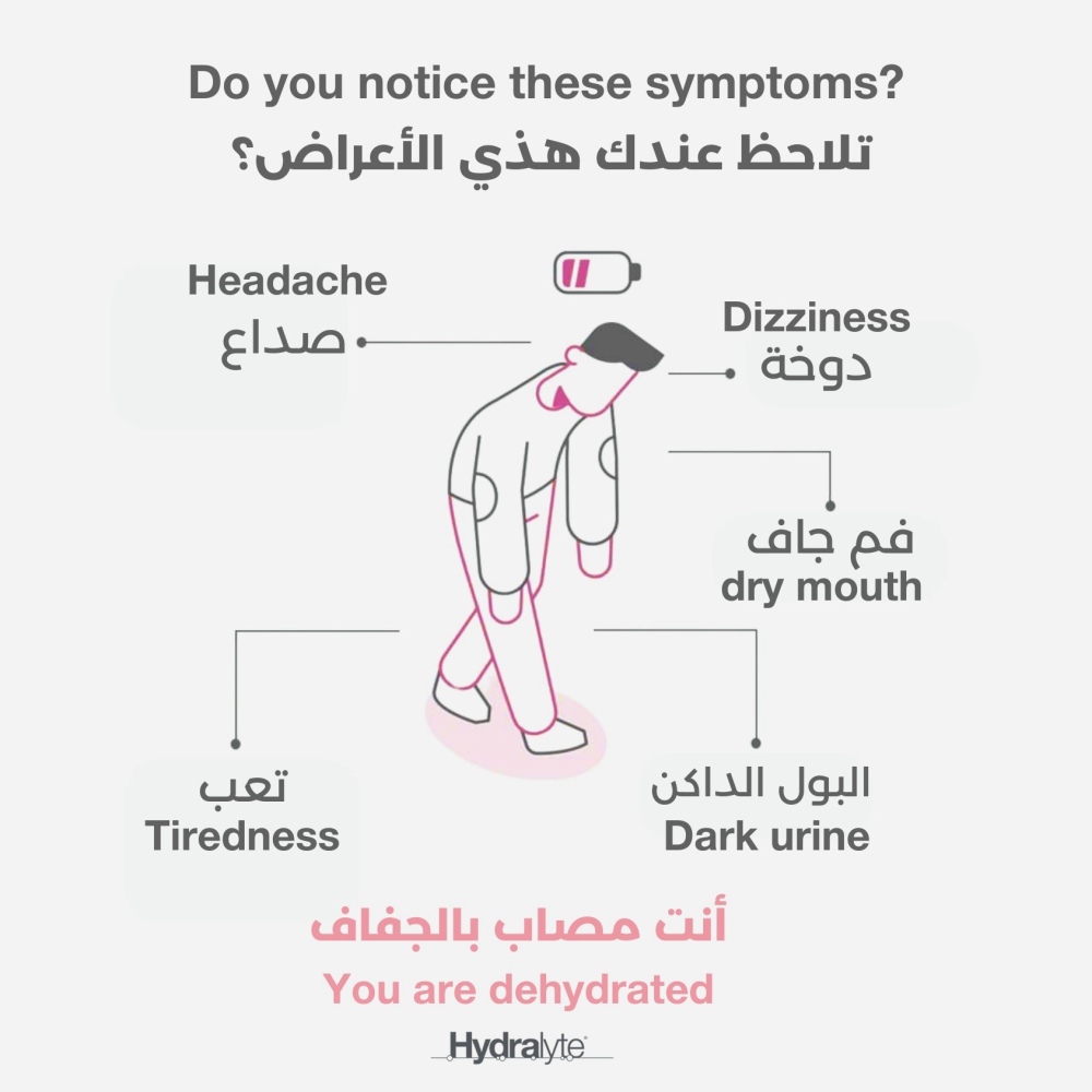 إذا شعرت بالعطش المستمر، صداع، إرهاق، أو بول داكن اللون.